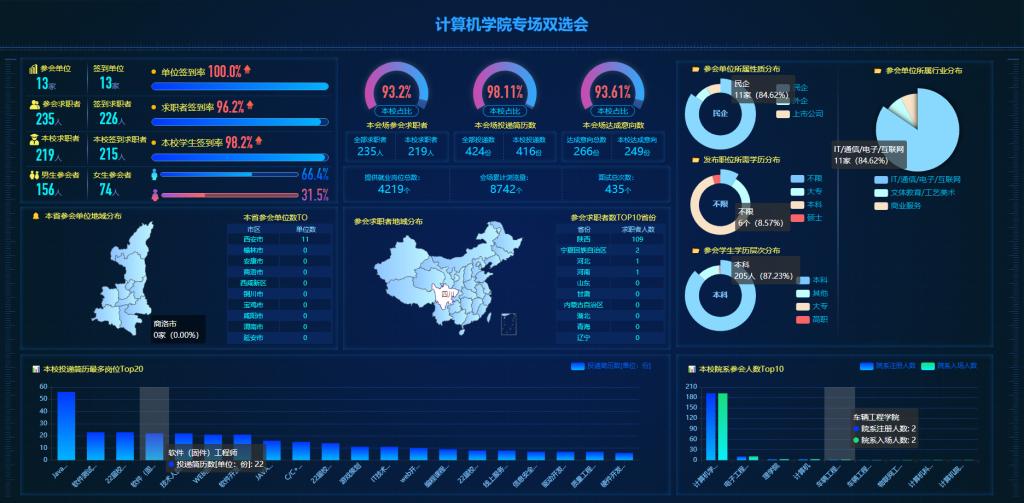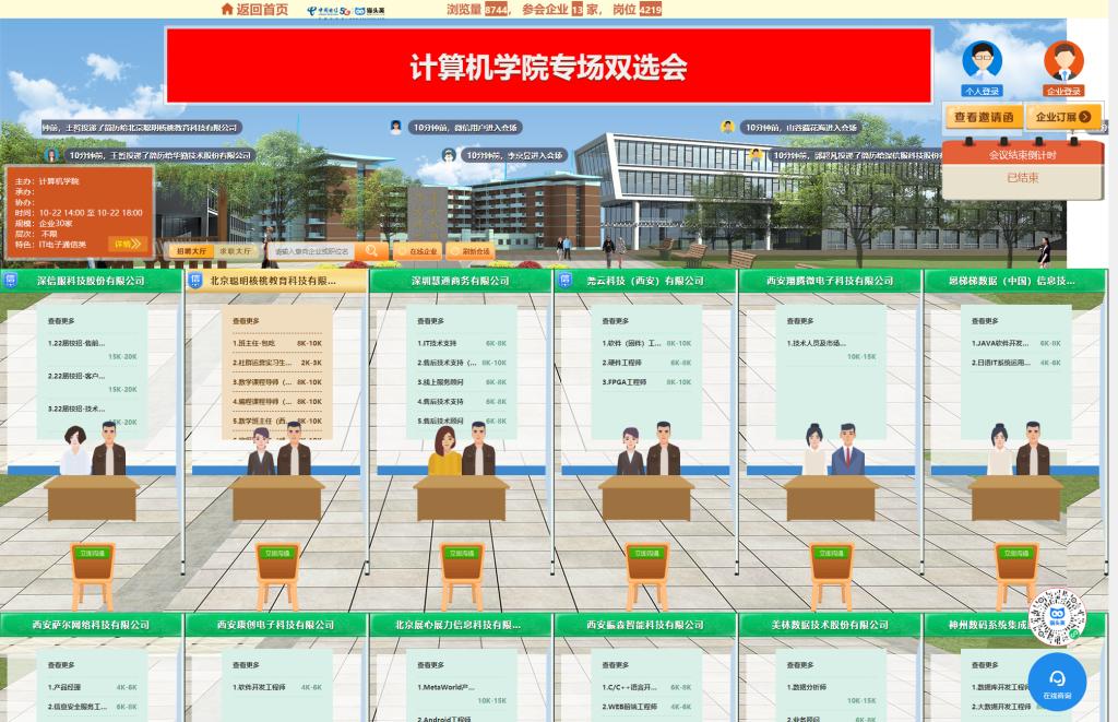 本次网络视频双选会,公司择优筛选参会单位13家, 提供就业岗位4000余个,毕业生累计投出简历400份次,视频面试400人次。