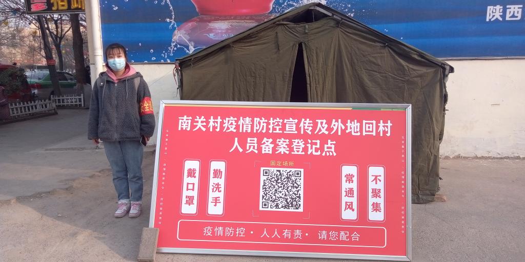 为积极响应家乡疫情防控号召,王璇妮同学在假期返乡后主动向村里报名志愿者,成为了咸阳市长武县昭仁街道办南关村的一名老员工志愿者。在防疫期间,她和其他志愿者一起进行防疫工作,主要负责村口执勤及外来人员的扫码登记等工作。