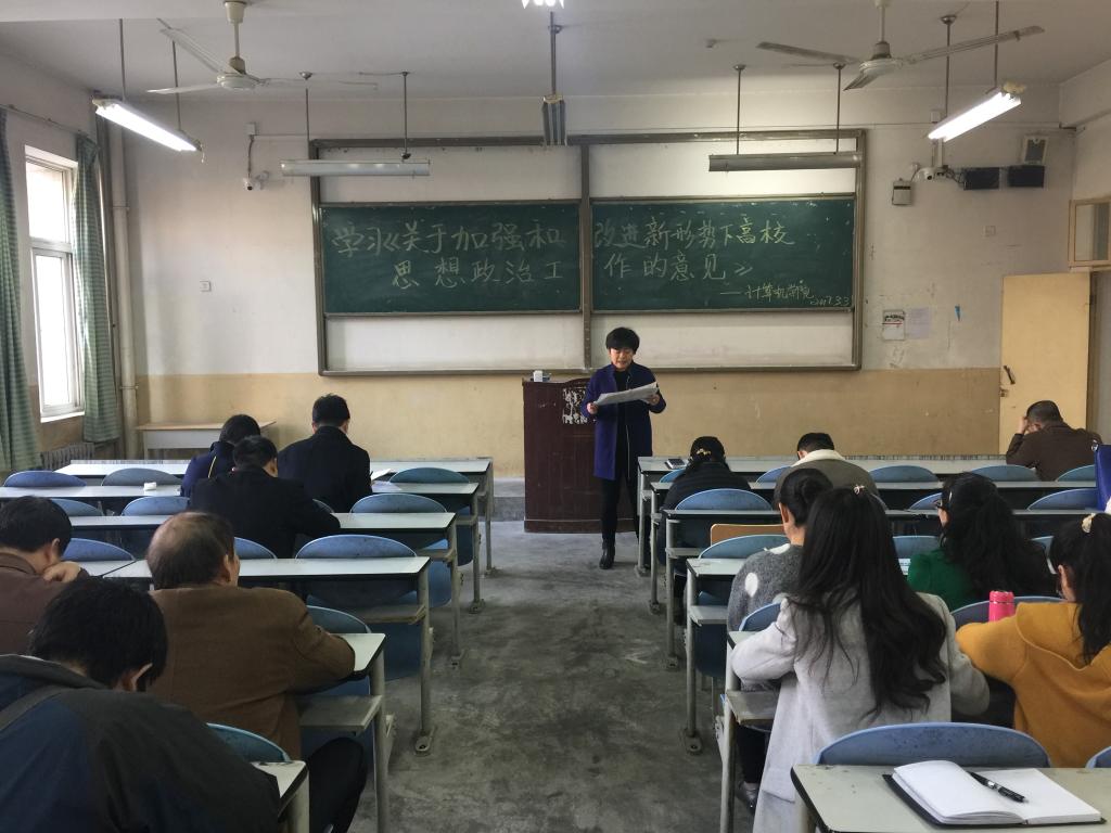 近日,中共中央、国务院印发了《关于加强和改进新形势下高校思想政治工作的意见》(简称《意见》)。3月3日下午,太阳成集团tyc539党总支书记刘晋云带领全体教职工学习《意见》的有关内容和精神。
