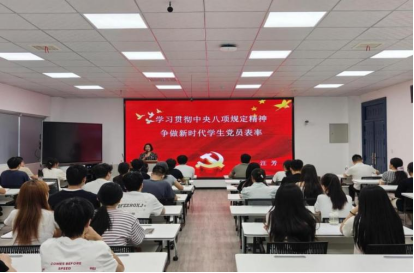 汪芳围绕中央八项规定精神出台背景、主要内容、实施细则等向同学们做了详细的讲解。同时,汪芳就青年党员如何落实中央八项规定精神提出要求和期待,希望同学们紧扣“舍风、考风、学风、班风”深耕细悟,以实际行动让中央八项规定精神在校园落地生根。
